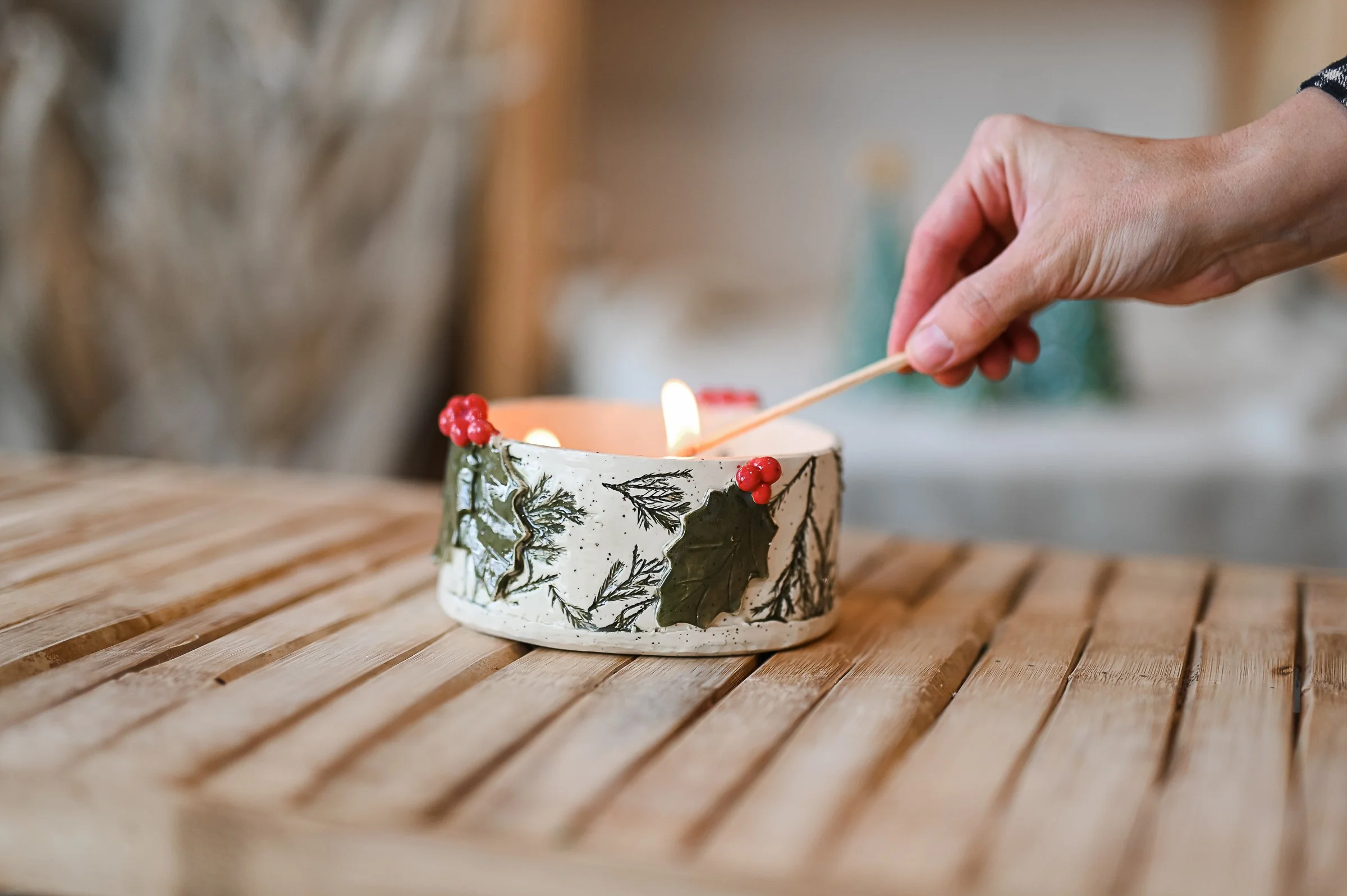 Celebrate the season by handcrafting your very own ceramic frasier fir candle! In this festive workshop, you’ll hand build your piece and add holiday-inspired textures, pressing real branches into the clay and sculpting details like holly leaves and berries to decorate the outside. Once your vessel is complete, we’ll glaze, fire, and finish it for you, then hand-pour it with the classic evergreen scent of Frasier Fir. When you pick it up, you’ll have a one-of-a-kind holiday candle to light your home with cozy cheer, or to give as the perfect handmade gift!